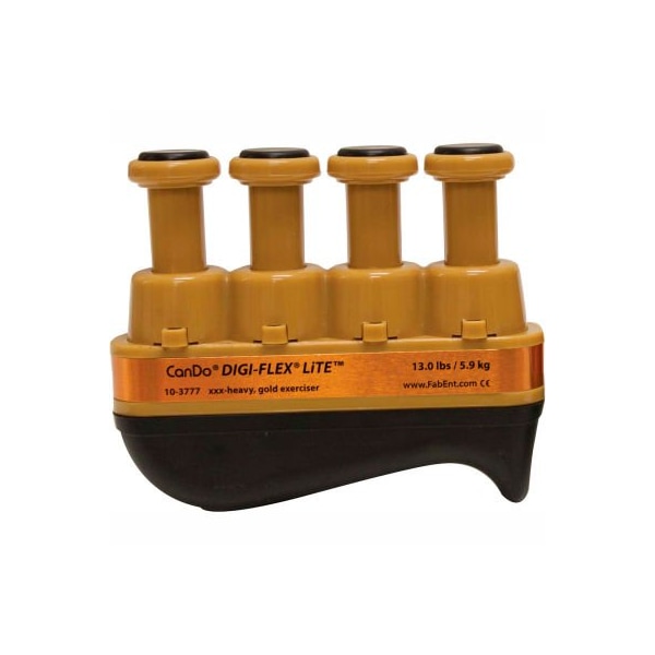 Cando digi-flex lite hand exerciser, gold, xxx-heavy the cando digi-flex lite develops isolated finger strength, flexibility and coordination as it builds hand and forearm strength. Each finger button can individually lock. Each button has a single spring that is covered by plastic sheath. Use each button independently to exercise fingers or compress the entire unit for complete hand and forearm strengthening. Progressivecolor-coded resistance gives patient positive feedback. Gold - xxx-heavy.