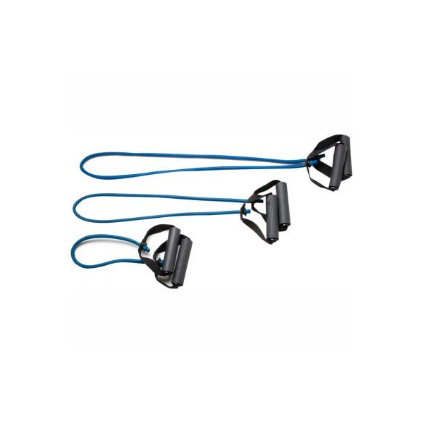 Cando exercise tubing with handles, full body set -18", 36", 48"), blue, 3/set lightweight, compact and portable, the tubing exerciser helps perform strengthening and conditioning workouts on-the-go, even in your hotel room!! two permanent foam covered rigid handles give the exerciser comfort and a firm grasp. Cando is licensed to use the thera-band color sequence so resistance level is easily identified. The tubing with handles exerciser is available in 7 levels of resistance for progressive exercise and 3 lengths to accommodate different needs. Levels range in order of strength from least to greatest resistance: tan, yellow, red, green, blue, black, silver. Length represents length of tubing from end to end when unit is laid flat and is taut. Cando low powder exercise tubing is made of natural rubber latex, which may cause allergic reactions. 3 piece full body set -18", 36", 48"), blue, heavy.