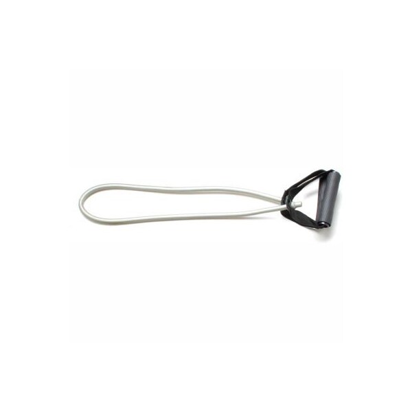 Cando exercise tubing with handles, silver, 36" lightweight, compact and portable, the tubing exerciser helps perform strengthening and conditioning workouts on-the-go, even in your hotel room!! two permanent foam covered rigid handles give the exerciser comfort and a firm grasp. Cando is licensed to use the thera-band color sequence so resistance level is easily identified. The tubing with handles exerciser is available in 7 levels of resistance for progressive exercise and 3 lengths to accommodate different needs. Levels range in order of strength from least to greatest resistance: tan, yellow, red, green, blue, black, silver. Length represents length of tubing from end to end when unit is laid flat and is taut. Cando low powder exercise tubing is made of natural rubber latex, which may cause allergic reactions. 36" - silver - xx-heavy.