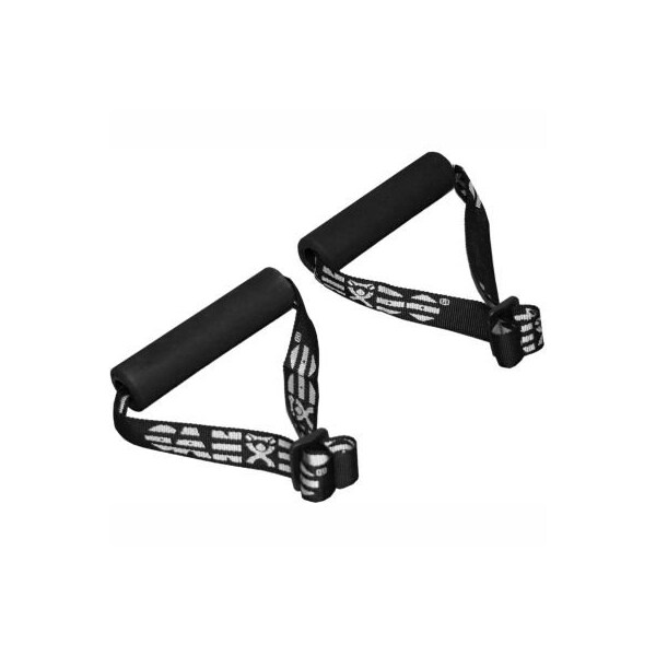 Cando foam padded handles with strap for exercise band/tubing, 1 pair the adjustable webbing handle makes exercising with band and tubing easier!! exercise band and tubing attaches to the foam handles for comfort and a firm grip. Each handle has a 6" long foam covered rigid bar. The handle has heavy-duty webbing for durability. It is easy to securely load and unload band or tubing into the handles.