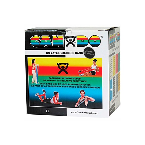 Cando latex-free exercise band, black, 25 yard roll, 1 roll/box cando resistive band exerciser roll is packaged in a dispenser box. Simply unroll desired length of exercise band from dispenser box and cut with scissors. Cando high quality synthetic latex free exercise band has been used for physical therapy and athletic training by clinics, fitness centers and individuals since 1987. It has become a well known staple of many physical therapy programs. The latex free formula has been specially created to mimic the stretch characteristics of latex band. Cando exercise band is an economic solution for upper and lower body exercise. Lightweight, compact and portable. Durable. Effective when used alone, or with handles and anchors. Color-coded according to the exercise band's resistance. Cando is licensed to use the thera-band color sequence so resistance level is easily identified. Available in 8 levels of resistance for progressive exercise. Levels range in order of strength from least to greatest resistance: tan, yellow, red, green, blue, black, silver, gold. Uniform width - each band is 5" wide. 25 yard roll - black - x-heavy.