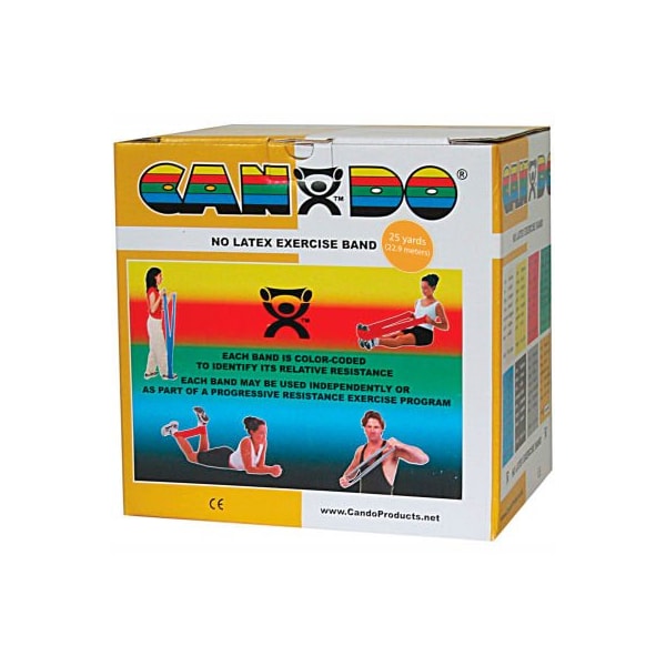 Cando latex-free exercise band, gold, 25 yard roll, 1 roll/box cando resistive band exerciser roll is packaged in a dispenser box. Simply unroll desired length of exercise band from dispenser box and cut with scissors. Cando high quality synthetic latex free exercise band has been used for physical therapy and athletic training by clinics, fitness centers and individuals since 1987. It has become a well known staple of many physical therapy programs. The latex free formula has been specially created to mimic the stretch characteristics of latex band. Cando exercise band is an economic solution for upper and lower body exercise. Lightweight, compact and portable. Durable. Effective when used alone, or with handles and anchors. Color-coded according to the exercise band's resistance. Cando is licensed to use the thera-band color sequence so resistance level is easily identified. Available in 8 levels of resistance for progressive exercise. Levels range in order of strength from least to greatest resistance: tan, yellow, red, green, blue, black, silver, gold. Uniform width - each band is 5" wide. 25 yard roll - gold - xxx-heavy.