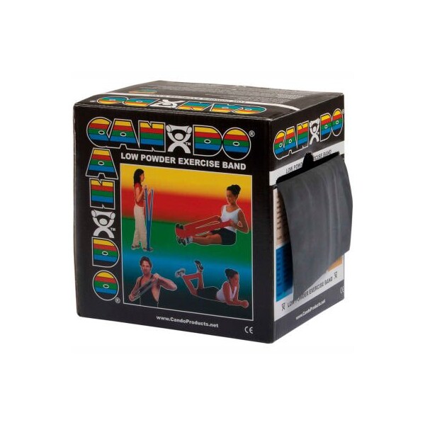 Cando low powder exercise band, black, 50 yard roll, 1 roll/box cando resistive exercise band roll is packaged in a dispenser box. Simply unroll desired length of exercise band from dispenser box and cut with scissors. Cando high quality latex resistive exercise band has been used in clinics for rehabilitation, conditioning and training since 1987. It has become a well known staple of many physical therapy programs. Cando exercise band is an economic solution for upper and lower body exercise. Lightweight, compact and portable. Durable. Effective when used alone, or with handles and anchors. Color-coded according to the exercise band's resistance. Cando is licensed to use the thera-band color sequence so resistance level is easily identified. Available in 8 levels of resistance for progressive exercise. Levels range in order of strength from least to greatest resistance: tan, yellow, red, green, blue, black, silver, gold. Uniform width - each band is 5" wide. 50 yard rolls have a core that fits most dispenser racks. Cando low powder exercise band is made of natural rubber latex, which may cause allergic reactions. For those with latex sensitivities, there are latex-free alternative offerings of cando exercise band. 50 yard roll - black - x-heavy.
