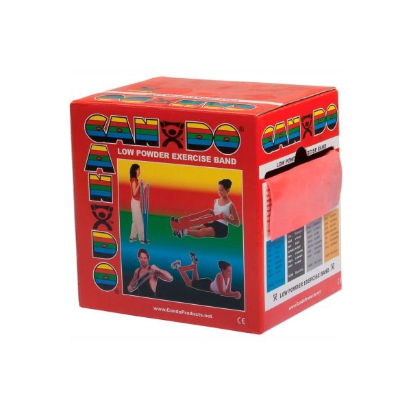 Cando low powder exercise band, red, 50 yard roll, 1 roll/box cando resistive exercise band roll is packaged in a dispenser box. Simply unroll desired length of exercise band from dispenser box and cut with scissors. Cando high quality latex resistive exercise band has been used in clinics for rehabilitation, conditioning and training since 1987. It has become a well known staple of many physical therapy programs. Cando exercise band is an economic solution for upper and lower body exercise. Lightweight, compact and portable. Durable. Effective when used alone, or with handles and anchors. Color-coded according to the exercise band's resistance. Cando is licensed to use the thera-band color sequence so resistance level is easily identified. Available in 8 levels of resistance for progressive exercise. Levels range in order of strength from least to greatest resistance: tan, yellow, red, green, blue, black, silver, gold. Uniform width - each band is 5" wide. 50 yard rolls have a core that fits most dispenser racks. Cando low powder exercise band is made of natural rubber latex, which may cause allergic reactions. For those with latex sensitivities, there are latex-free alternative offerings of cando exercise band. 50 yard roll - red - light.