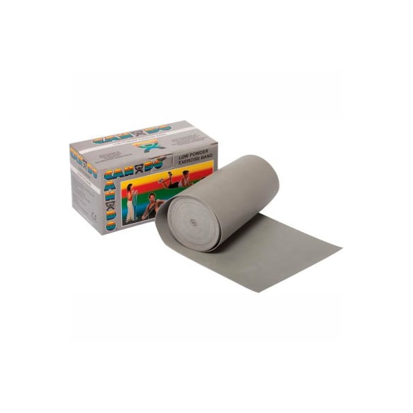 Cando low powder exercise band, silver, 6 yard roll, 1 roll/box cando resistive exercise band roll is packaged in a dispenser box. Simply unroll desired length of exercise band from dispenser box and cut with scissors. Cando high quality latex resistive exercise band has been used in clinics for rehabilitation, conditioning and training since 1987. It has become a well known staple of many physical therapy programs. Cando exercise band is an economic solution for upper and lower body exercise. Lightweight, compact and portable. Durable. Effective when used alone, or with handles and anchors. Color-coded according to the exercise band's resistance. Cando is licensed to use the thera-band color sequence so resistance level is easily identified. Available in 8 levels of resistance for progressive exercise. Levels range in order of strength from least to greatest resistance: tan, yellow, red, green, blue, black, silver, gold. Uniform width - each band is 5" wide. Cando low powder exercise band is made of natural rubber latex, which may cause allergic reactions. For those with latex sensitivities, there are latex-free alternative offerings of cando exercise band. 6 yard roll - silver - xx-heavy.