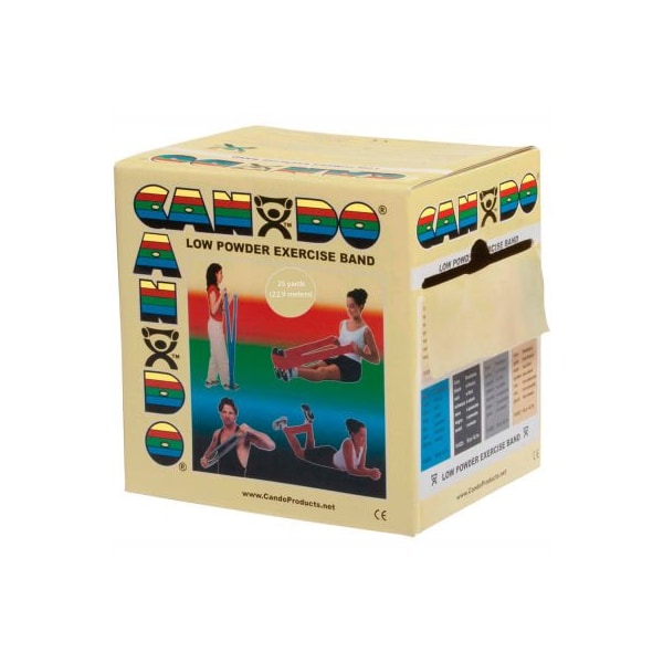 Cando low powder exercise band, tan, 25 yard roll, 1 roll/box cando resistive exercise band roll is packaged in a dispenser box. Simply unroll desired length of exercise band from dispenser box and cut with scissors. Cando high quality latex resistive exercise band has been used in clinics for rehabilitation, conditioning and training since 1987. It has become a well known staple of many physical therapy programs. Cando exercise band is an economic solution for upper and lower body exercise. Lightweight, compact and portable. Durable. Effective when used alone, or with handles and anchors. Color-coded according to the exercise band's resistance. Cando is licensed to use the thera-band color sequence so resistance level is easily identified. Available in 8 levels of resistance for progressive exercise. Levels range in order of strength from least to greatest resistance: tan, yellow, red, green, blue, black, silver, gold. Uniform width - each band is 5" wide. Cando low powder exercise band is made of natural rubber latex, which may cause allergic reactions. For those with latex sensitivities, there are latex-free alternative offerings of cando exercise band. 25 yard roll - tan - xx-light.