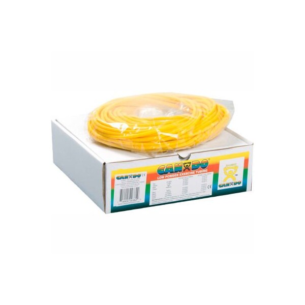 Cando low powder exercise tubing, yellow, 100' roll/box cando high quality latex resistive exercise tubing has been used in clinics for rehabilitation, conditioning and training since 1987. It has become a staple of many physical therapy and athletic training programs. Cando exercise tubing is an economic solution for upper and lower body exercise. It is lightweight, portable and durable. Effective when used alone, or with handles and anchors. Exercise tubing is color-coded according to resistance. Simply unroll desired length of exercise tubing and cut with scissors. Cando is licensed to use the thera-band color sequence so resistance level is easily identified. Tubing is available in 8 resistance levels. Levels range in order of strength from least to greatest resistance: tan, yellow, red, green, blue, black, silver, gold. Cando low powder exercise tubing is made of natural rubber latex, which may cause allergic reactions. For those with latex sensitivities, there are latex-free alternative offerings of cando exercise tubing. 100' dispenser roll - yellow - x-light