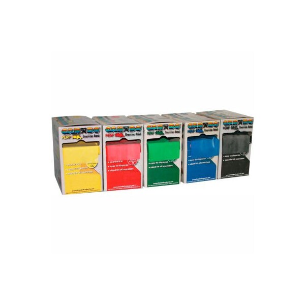Cando perf 100 low powder exercise band, 100 yd rolls, 5 color set cando perf 100 economic bulk size roll is the best value for large clinics. The cando perf 100 offers a true 100 yard roll of exercise band in a convenient dispenser box. The band is perforated every 5 feet. There are 60 5-foot exercisers in each roll. To prepare exercise band for use simply pull 5 foot length from dispenser box and separate perforation line by hand. No scissors are needed. Cando high quality latex resistive exercise band has been used in clinics for rehabilitation, conditioning and training since 1987. It has become a well known staple of many physical therapy programs. Cando exercise band is an economic solution for upper and lower body exercise. Lightweight, compact and portable. Durable. Effective when used alone, or with handles and anchors. Color-coded according to the exercise band's resistance. Cando is licensed to use the thera-band color sequence so resistance level is easily identified. Available in 8 levels of resistance for progressive exercise. Levels range in order of strength from least to greatest resistance: tan, yellow, red, green, blue, black, silver, gold. Uniform width - each band is 5" wide. Cando low powder exercise band is made of natural rubber latex, which may cause allergic reactions. For those with latex sensitivities, there are latex-free alternative offerings of cando exercise band. 100 yard perf 100 rolls, 5 piece set - 1 each: yellow, red, green, blue, black.