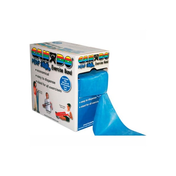 Cando perf 100 low powder exercise band, blue, 100 yd roll, 1 roll/box cando perf 100 economic bulk size roll is the best value for large clinics. The cando perf 100 offers a true 100 yard roll of exercise band in a convenient dispenser box. The band is perforated every 5 feet. There are 60 5-foot exercisers in each roll. To prepare exercise band for use simply pull 5 foot length from dispenser box and separate perforation line by hand. No scissors are needed. Cando high quality latex resistive exercise band has been used in clinics for rehabilitation, conditioning and training since 1987. It has become a well known staple of many physical therapy programs. Cando exercise band is an economic solution for upper and lower body exercise. Lightweight, compact and portable. Durable. Effective when used alone, or with handles and anchors. Color-coded according to the exercise band's resistance. Cando is licensed to use the thera-band color sequence so resistance level is easily identified. Available in 8 levels of resistance for progressive exercise. Levels range in order of strength from least to greatest resistance: tan, yellow, red, green, blue, black, silver, gold. Uniform width - each band is 5" wide. Cando low powder exercise band is made of natural rubber latex, which may cause allergic reactions. For those with latex sensitivities, there are latex-free alternative offerings of cando exercise band. 100 yard perf 100 roll - blue - heavy.