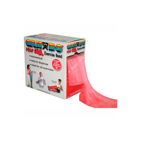 Cando perf 100 low powder exercise band, red, 100 yd roll, 1 roll/box cando perf 100 economic bulk size roll is the best value for large clinics. The cando perf 100 offers a true 100 yard roll of exercise band in a convenient dispenser box. The band is perforated every 5 feet. There are 60 5-foot exercisers in each roll. To prepare exercise band for use simply pull 5 foot length from dispenser box and separate perforation line by hand. No scissors are needed. Cando high quality latex resistive exercise band has been used in clinics for rehabilitation, conditioning and training since 1987. It has become a well known staple of many physical therapy programs. Cando exercise band is an economic solution for upper and lower body exercise. Lightweight, compact and portable. Durable. Effective when used alone, or with handles and anchors. Color-coded according to the exercise band's resistance. Cando is licensed to use the thera-band color sequence so resistance level is easily identified. Available in 8 levels of resistance for progressive exercise. Levels range in order of strength from least to greatest resistance: tan, yellow, red, green, blue, black, silver, gold. Uniform width - each band is 5" wide. Cando low powder exercise band is made of natural rubber latex, which may cause allergic reactions. For those with latex sensitivities, there are latex-free alternative offerings of cando exercise band. 100 yard perf 100 roll - red - light.