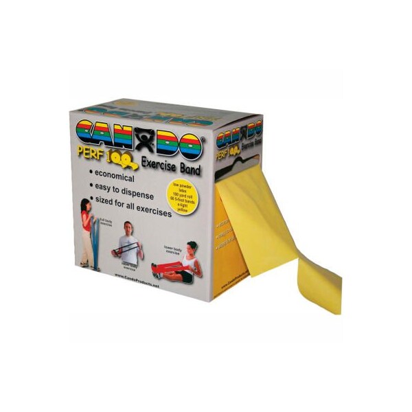 Cando perf 100 low powder exercise band, yellow, 100 yd roll, 1 roll/box cando perf 100 economic bulk size roll is the best value for large clinics. The cando perf 100 offers a true 100 yard roll of exercise band in a convenient dispenser box. The band is perforated every 5 feet. There are 60 5-foot exercisers in each roll. To prepare exercise band for use simply pull 5 foot length from dispenser box and separate perforation line by hand. No scissors are needed cando high quality latex resistive exercise band has been used in clinics for rehabilitation, conditioning and training since 1987. It has become a well known staple of many physical therapy programs. Cando exercise band is an economic solution for upper and lower body exercise. Lightweight, compact and portable. Durable. Effective when used alone, or with handles and anchors. Color-coded according to the exercise band's resistance. Cando is licensed to use the thera-band color sequence so resistance level is easily identified. Available in 8 levels of resistance for progressive exercise. Levels range in order of strength from least to greatest resistance: tan, yellow, red, green, blue, black, silver, gold. Uniform width - each band is 5" wide. Cando low powder exercise band is made of natural rubber latex, which may cause allergic reactions. For those with latex sensitivities, there are latex-free alternative offerings of cando exercise band. 100 yard perf 100 roll - yellow - x-light.