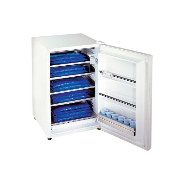 Colpac chilling unit with 12 standard cold packs chilling unit effectively chills cold packs and keeps the packs in a chilled ready-to-use state. Colpac freezer has five cubic foot capacity. Stainless steel shelves. Designed to quickly chill cold packs. Comes with trays and cup holders. Includes 12 standard size colpac compresses. Dimensions: 26" x 21" x 33".
