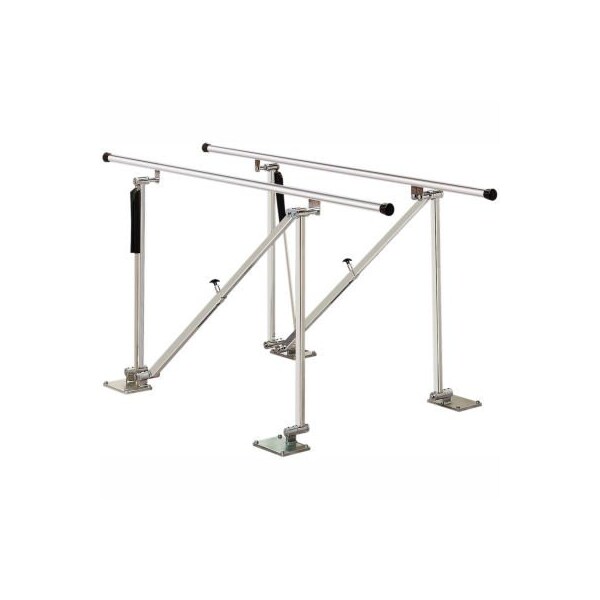 single operator adjustable parallel bars are floor mounted. One person can change these bars faster than any other manually adjusted bars. A practical alternative to motorized bars. Every height adjustment necessary can be made from a single location. Durable, safe and very simple to use with height and width permanently stamped on frame. Single plunger/lock. Handrail size 1-1/2". Height adjusts from 31" to 41"h. 22-1/2"w between handrails.