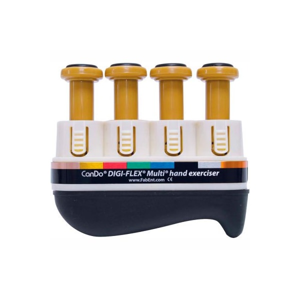 Digi-flex multi hand exerciser, basic starter pack, gold, xxx-heavy the digi-flex multi hand exerciser develops isolated finger strength, flexibility and coordination. Interchangeable finger buttons make the multi a truly versatile exerciser. Use each button independently to exercise fingers or compress the entire unit for complete hand and forearm strengthening. Change resistance for any finger by changing the finger button. Finger buttons snap into base with ease. Base has padded ergonomic palm bar. There are 8 levels of finger buttons available: tan (xx-light), yellow (x-light), red (light), green (medium), blue (heavy), black (x-heavy), silver (xx-heavy), gold (xxx-heavy). Clinic hand therapy and home exerciser kits, as well as individual components available. Basic starter pack - base and 4 gold xxx-heavy buttons.
