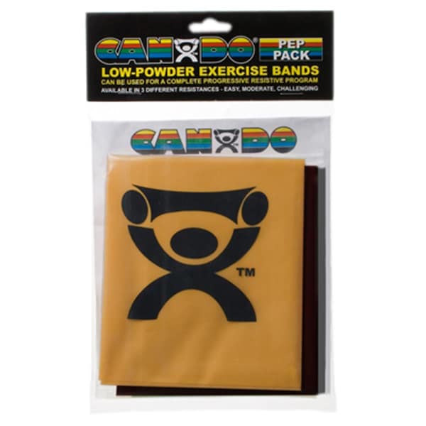The CanDoLow-Powder exercise band PEPpack can be used for a progressive resistance exercise program. Each Peppack comes with three different 4-foot bands and an illustrated instruction/exercise chart. Each exerciser is packaged in a polybag. Simply remove exercise band from polybag and it is ready to use. CanDohigh quality latex resistive exercise band has been used in clinics for rehabilitation, conditioning and training. It has become a staple of many physical therapy programs.