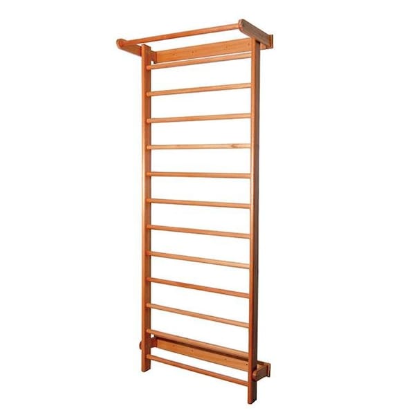 The wooden stall bars are a versatile piece of equipment perfect for sports medicine clinics, gyms, physical therapy clinics, and hospitals alike. Users can perform shoulder range of motion exercise from a sitting or standing position. The top rungs of the wooden stall bars are designed for chin-ups or pull-ups. The bars are approximately 7"apart and are made from eucalyptus wood and coated in an anti-humidity sealer. The weight capacity is 250 pounds.