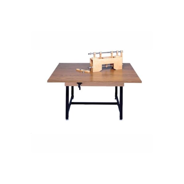 economy hi-low work table (shown with assembly device). English oak laminate top is 48"wide x 60"long x 1-1/8" thick. Manual hydraulic adjustment from 28" to 35-1/2"high. Built in floor levelers. Black enamel steel frame.
