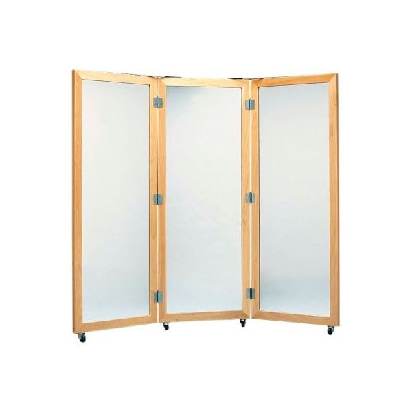 plate glass 3-way mirror: glass size 17" x 53" each panel, overall size 22" x 60-1/2" each panel including casters. Plate glass mirrors are an invaluable aid to physical, speech, occupational therapy and sports medicine departments. May be used in a variety of ways: in exercise and weight rooms, or with parallel bars and training stairs. Generously sized, distortion-free 1/4" plate glass mirrors are mounted in natural finish hardwood frames. Mobile units furnished with 2" casters. please note: these mirrors are made to order, and carry a no return policy. In addition, as these mirrors do ship by truck, please be sure to check for damage at the time of delivery. If there is any damage to the product, customer should refuse delivery and contact global's customer service for further assistance.