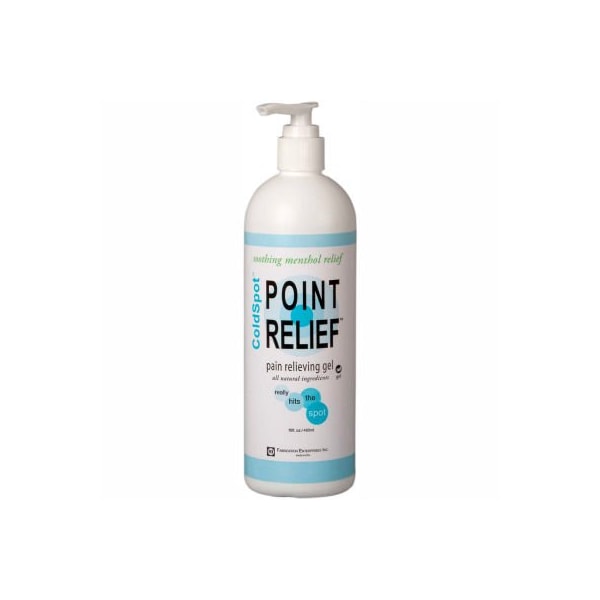 Point relief coldspot pain relief gel, 16 oz. Pump bottle point relief coldspot topical analgesics are available with gel, roll-on and spray applicators. The over-the-counter formulas offers fast-acting, soothing, temporary relief of minor aches and pains of muscles and joints associated with simple backache, arthritis, bruises, strains and sprains. Water-based formula minimizes grease and residue. Coldspot includes all natural ingredients including menthol, msm, ilex, and arnica. Has refreshing peppermint scent. Point relief coldspot has a high active menthol concentration compared to some other leading brands. Gel pump bottle - 16 oz.