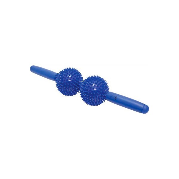 Point relief massage bar, 9 x 43 cm (3.5" x 16.9"), 2 balls, blue, 1 each point relief massage bar has padded handles. Massage and relax, sore knotted muscles. Use to increase blood flow. Spiky balls rotate freely on massage bar. Padded handles.
