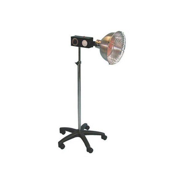 mobile lamp with timer and variable control. Adjustable 31" to 52". Extends 15" over bed. Designed for use in hospitals, clinics and large practices. Equipped with 3 conductor cord sets with hospital grade plugs, a control panel that houses an on/off indicator light and either an intensity control and 30 minute timer switch. 750w ceramic heating element electromagnetically transmits extremely uniform heat to the patient. Unit changes from coral to gray when energized. No visible light produced. Nickel-chromium resistance wire embedded into a ceramic casting provides uniform heat transmission, 96% thermal efficiency with low element surface temperature. Inner body of the element is filled with ceramic fiber insulation, which conserves energy, maximizes efficiency and minimizes heat build-up at the terminal area. Heat up time is 3 - 9 minutes to reach 90 degrees of maximum temperature.