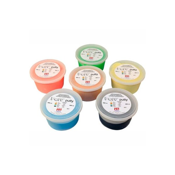 Puff lite color-coded exercise putty, 400cc, set of 6 puff lite has a light and airy feel vs. Traditional cando theraputty. Available in 6 resistance levels. Puff lite is available in the preferred color sequence. Each color-coded putty has a different consistency ranging from xx-soft for strengthening the weakest grasp to xx-firm for developing a stronger grip. The putty material is gluten, casein and latex free. 6 piece set - 1 of each color in different consistencies, 400cc.