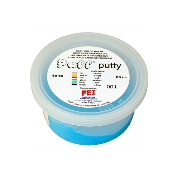 Puff lite color-coded exercise putty, firm, blue, 60cc puff lite has a light and airy feel vs. Traditional cando theraputty. Available in 6 resistance levels. Puff lite is available in the preferred color sequence. Each color-coded putty has a different consistency ranging from xx-soft for strengthening the weakest grasp to xx-firm for developing a stronger grip. The putty material is gluten, casein and latex free. Blue, firm, 60cc.