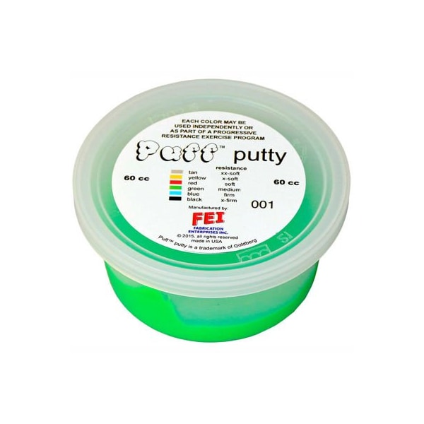 Puff lite color-coded exercise putty, medium, green, 60cc puff lite has a light and airy feel vs. Traditional cando theraputty. Available in 6 resistance levels. Puff lite is available in the preferred color sequence. Each color-coded putty has a different consistency ranging from xx-soft for strengthening the weakest grasp to xx-firm for developing a stronger grip. The putty material is gluten, casein and latex free. Green, medium, 60cc.