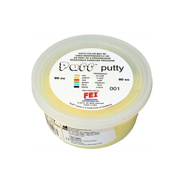 Puff lite color-coded exercise putty, x-soft, yellow, 90cc puff lite has a light and airy feel vs. Traditional cando theraputty. Available in 6 resistance levels. Puff lite is available in the preferred color sequence. Each color-coded putty has a different consistency ranging from xx-soft for strengthening the weakest grasp to xx-firm for developing a stronger grip. The putty material is gluten, casein and latex free. Yellow, x-soft, 90cc.