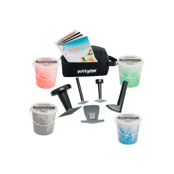 Puttycise theraputty set, 5 tools, 4 x 5 lb. Putties, hard (red, green, blue, black) there's a new twist in hand therapy. Puttycise is great for use with theraputty to increase function and versatility. 5 piece tool set includes the cap turn, key turn, knob turn, l-bar, and peg turn. Each tool helps simulate various functions to help with everyday life. Kit includes carry bag and theraputty exercise material as specified in product title. 5-tool set with 4 x 5 lb. Putties, difficult (red-black), with bag.