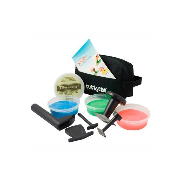 Puttycise theraputty set, 5 tools, 4 x 6 oz. Putties, medium (yellow, red, green, blue) there's a new twist in hand therapy. Puttycise is great for use with theraputty to increase function and versatility. 5 piece tool set includes the cap turn, key turn, knob turn, l-bar, and peg turn. Each tool helps simulate various functions to help with everyday life. Kit includes carry bag and theraputty exercise material as specified in product title. 5-tool set with 4 x 6 oz. Putties, moderate (yellow-blue), with bag.