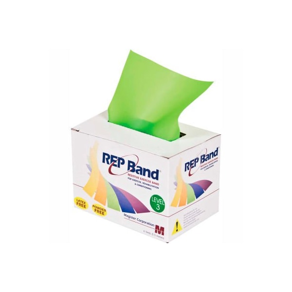 Rep band latex free exercise band, lime, 6 yard roll/box rep band resistance exercise bands are latex-free. Rep band is 4" in width and available in 6 yard and 50 yard dispenser boxes. Available in 5 color-coded resistance levels from peach -easiest), orange, green blue, plum -hardest). 6 yard - lime, level 3.