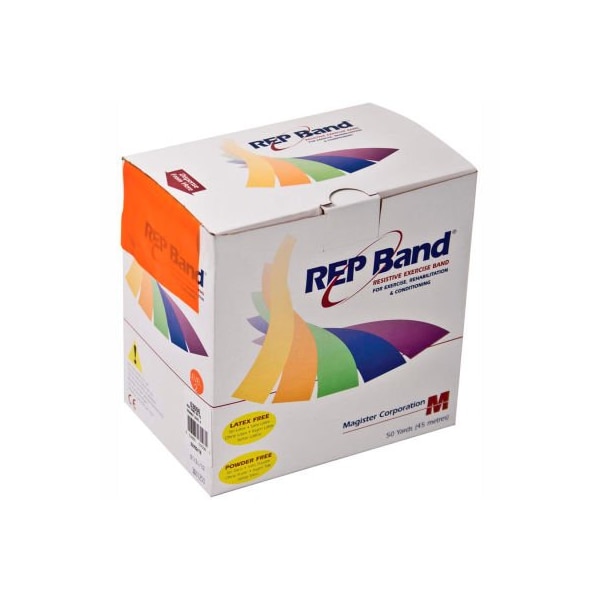 Rep band latex free exercise band, orange, 50 yard roll/box rep band resistance exercise bands are latex-free. Rep band is 4" in width and available in 6 yard and 50 yard dispenser boxes. Available in 5 color-coded resistance levels from peach -easiest), orange, green, blue, plum -hardest). 50 yard - orange, level 2.