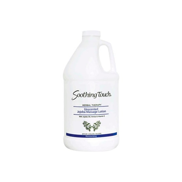 Soothing touch jojoba unscented lotion, 1/2 gallon 1/2 gallon: jojoba herbal massage lotion offers your clients the very best in skin nutrition without the scent. Smooth and effortless to apply, this lotion is perfect for deep tissue work, reflexology or when you are looking for a little more absorption. Enhanced with jojoba oil, arnica, aloe, herbal infusions and vitamin e this lotion gives the massage therapist the perfect glide for the perfect massage. Unscented - non greasy - water dispersible - washes from sheet.