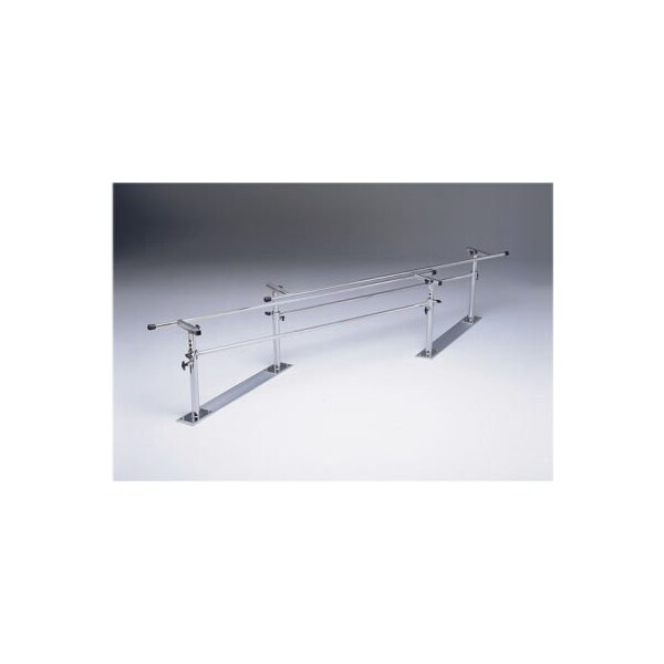 these sturdy and stable folding parallel bars with a 42" base require only 14" of floor space when not in use. Wood base unit comes with one stabilizing bar to lock parallel bars in open position. To store the space saving bars, simply unlock and slide until handrails are nearly touching. Add 3 feet to length when folded. Length 7'. Wood base is 42"l x 7"w x 1-1/4"h. Steel base is 42"l x 5"w x 1/4"h. Height adjusts from 22" to 36"h. Width adjusts from 16" to 24"w. Hand rail size 1-1/2"diameter. Can be used with optional model 90 divider board. Allows wheelchair access with a distance of 31-1/2" clearance between posts.