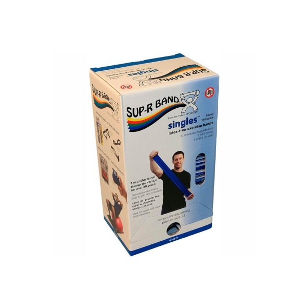 Sup-r band latex free exercise band, 5' strips, blue, 30 strips/box sup-r band is made from a premium latex free formula and excels compared to other exercise band: our tpe latex free formula has similar use and strength characteristics to latex exercise bands; similar puncture resistance; similar tear and burst strength; requires similar forceto stretch and contract; 5" width; has core for use with dispenser systems; made of thermoplastic elastomer -tpe); color-codedin thera-band colors. Retail dispenser box contains -30) 5 foot individual packaged pieces. 5 foot singles -30 piece dispenser) - blue.
