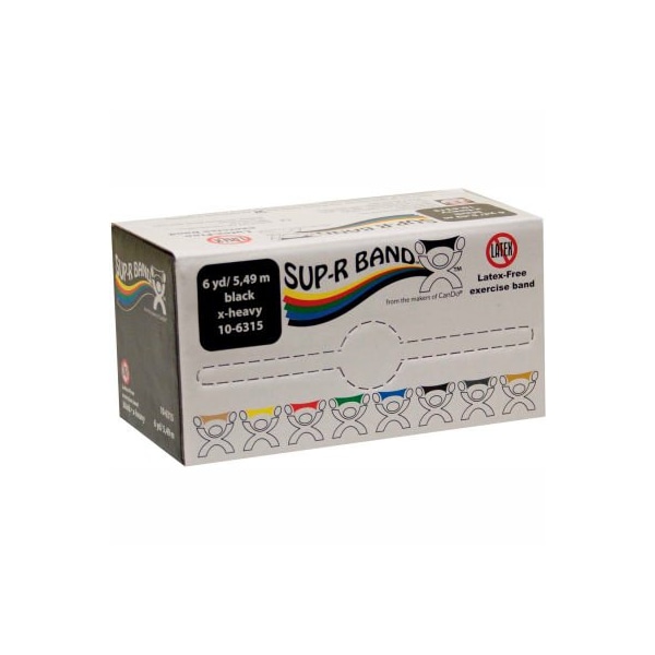 Sup-r band latex free exercise band, black, 6 yard roll/box sup-r band is made from a premium latex free formula and excels compared to other exercise band: our tpe latex free formula has similar use and strength characteristics to latex exercise bands; similar puncture resistance; similar tear and burst strength; requires similar force to stretch and contract; 5" width; has core for use with dispenser systems; made of thermoplastic elastomer -tpe); color-coded in thera-band colors. Roll is packaged in a dispenser box. 50 yard roll has core that fits most dispenser racks. Simply unroll desired length of exercise band from dispenser box and cut with scissors. 6 yard roll - black - x-heavy.