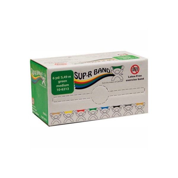 Sup-r band latex free exercise band, green, 6 yard roll/box sup-r band is made from a premium latex free formula and excels compared to other exercise band: our tpe latex free formula has similar use and strength characteristics to latex exercise bands; similar puncture resistance; similar tear and burst strength; requires similar force to stretch and contract; 5" width; has core for use with dispenser systems; made of thermoplastic elastomer -tpe); color-coded in thera-band colors. Roll is packaged in a dispenser box. 50 yard roll has core that fits most dispenser racks. Simply unroll desired length of exercise band from dispenser box and cut with scissors. 6 yard roll - green - medium.