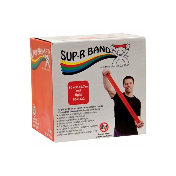 Sup-r band latex free exercise band, red, 50 yard roll/box sup-r band is made from a premium latex free formula and excels compared to other exercise band: our tpe latex free formula has similar use and strength characteristics to latex exercise bands; similar puncture resistance; similar tear and burst strength; requires similar force to stretch and contract; 5" width; has core for use with dispenser systems; made of thermoplastic elastomer -tpe); color-coded in thera-band colors. Roll is packaged in a dispenser box. 50 yard roll has core that fits most dispenser racks. Simply unroll desired length of exercise band from dispenser box and cut with scissors. 50 yard roll - red - light.