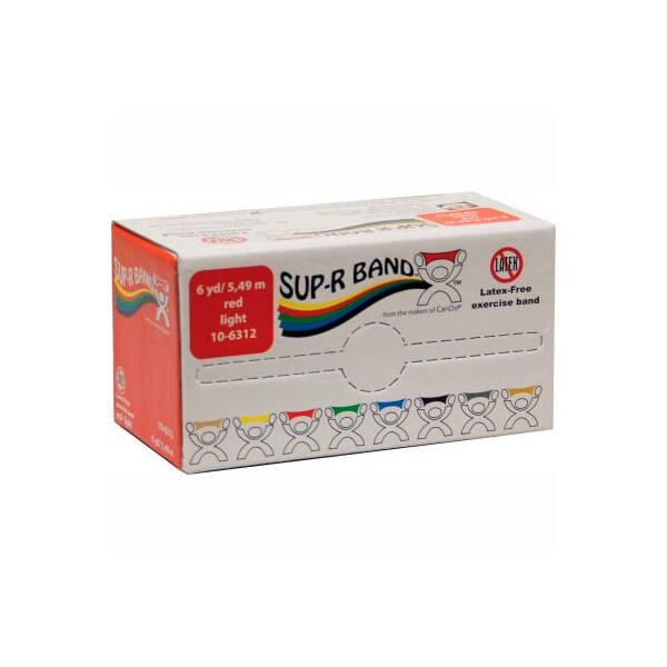 Sup-r band latex free exercise band, red, 6 yard roll/box sup-r band is made from a premium latex free formula and excels compared to other exercise band: our tpe latex free formula has similar use and strength characteristics to latex exercise bands; similar puncture resistance; similar tear and burst strength; requires similar force to stretch and contract; 5" width; has core for use with dispenser systems; made of thermoplastic elastomer -tpe); color-coded in thera-band colors. Roll is packaged in a dispenser box. Unroll desired length of exercise band from dispenser box and cut with scissors. 6 yard roll - red - light