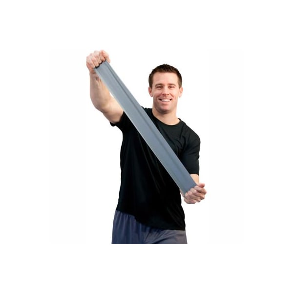 Sup-r band latex free exercise band, silver, 6 yard roll/box sup-r band is made from a premium latex free formula and excels compared to other exercise band: our tpe latex free formula has similar use and strength characteristics to latex exercise bands; similar puncture resistance; similar tear and burst strength; requires similar force to stretch and contract; 5" width; has core for use with dispenser systems; made of thermoplastic elastomer -tpe); color-coded in thera-band colors. Roll is packaged in a dispenser box. Unroll desired length of exercise band from dispenser box and cut with scissors. 6 yard roll - silver - xx-heavy.
