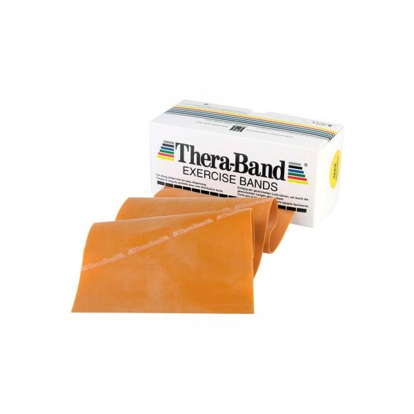 Thera-band latex exercise band, gold, 6 yard roll/box thera-band latex exercise band can be used independently or as part of a progressive exercise program. Band is 5" wide. Available in 6 and 50 yard rolls, 100 yard put-ups, and dispenser boxes of 30 x 4' pieces. 6 yard roll - gold - max