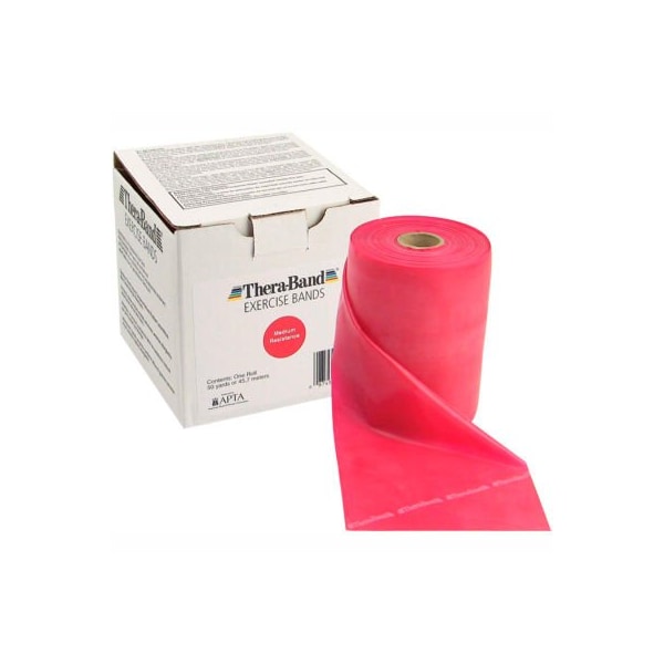 Thera-band latex exercise band, red, 50 yard roll/box thera-band latex exercise band can be used independently or as part of a progressive exercise program. Band is 5" wide. Available in 6 and 50 yard rolls, 100 yard put-ups, and dispenser boxes of 30 x 4' pieces. 50 yard roll - red - medium.
