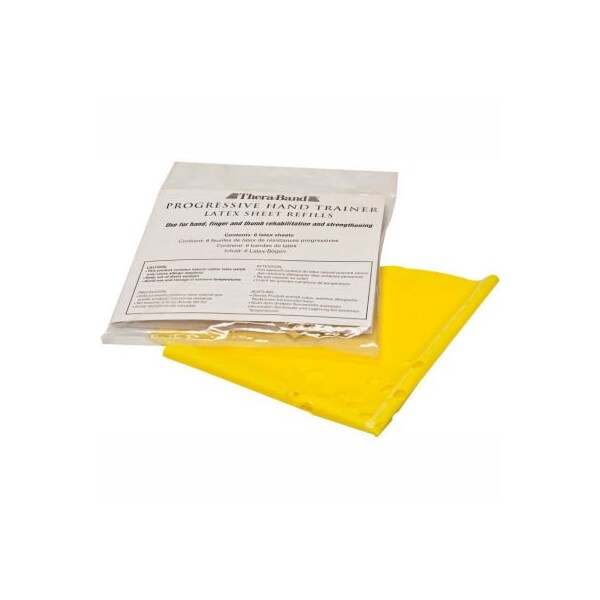 Thera-band progressive hand trainer, 6 sheet refills, yellow, x-light thera-band progressive hand trainer consists of exercise band with finger insertion holes that is held in place by two locking rings. To change the resistance, simply change the exercise sheet color. 6 refills - yellow - x-light.
