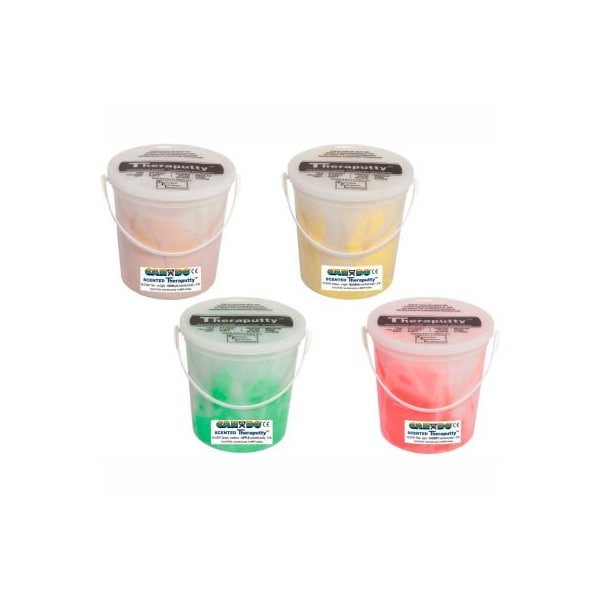 Theraputty scented exercise putty, 5 lb., 4-piece set (tan, yellow, red, green) exercise putty is used for hand therapy and to strengthen hand grasp. Scented theraputty hand exercise material makes hand therapy more pleasant for youngsters. Using scented putty is a fun way for children to develop grip strength and stay attentive and participate. Tan (vanilla) is xx-light, yellow (banana) is x-light, red (cherry) is light, green (apple) is medium. 5 lb. - 4-piece set, tan-green.