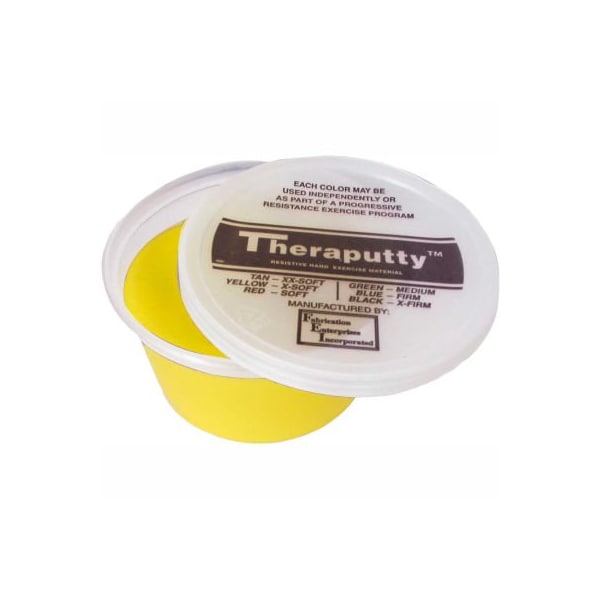 Theraputty standard exercise putty, yellow, x-soft, 2 ounce cando theraputty hand exercise material is the standard in resistive hand exercise material. Each color-coded putty has a different consistency ranging from xx-soft for strengthening the weakest grasp to extra-firm for developing a stronger grip. Available in convenient easy-to-open plastic containers (2, 3, 4 and 6 ounce) for individual patients to use at home and a choice of larger containers (1 and 5 pound) for the hospital or clinic. Cando theraputty material is gluten, latex and casein free. 2 oz. - yellow - x-soft.