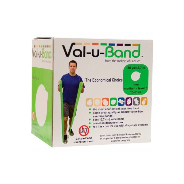 Val-u-band latex free exercise band, lime - level 3, 50 yard roll/box latex free resistive exercise val-u-band is color-coded in berry colors. Latex free val-u-band is an economical latex free exercise band; same great quality as cando latex exercise bands; 5" width band available in dispenser boxes; available in 6, 25 and 50 yard rolls; 50 yard roll has core for use with dispenser systems. Levels range in order of resistance from least to greatest resistance: pear -0), peach -1), orange -2), lime -3), blueberry -4), plum -5), mushroom -6), pineapple -7). 50 yard - lime -level 3.