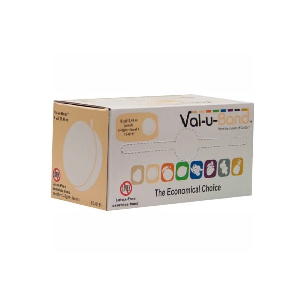 Val-u-band latex free exercise band, peach - level 1, 6 yard roll/box latex free resistive exercise val-u-band is color-coded in berry colors. Latex free val-u-band is an economical latex free exercise band; same great quality as cando latex exercise bands; 5" width band available in dispenser boxes; available in 6, 25 and 50 yard rolls; 50 yard roll has core for use with dispenser systems. Levels range in order of resistance from least to greatest resistance: pear -0), peach -1), orange -2), lime -3), blueberry -4), plum -5), mushroom -6), pineapple -7). 6 yard - peach -level 1).