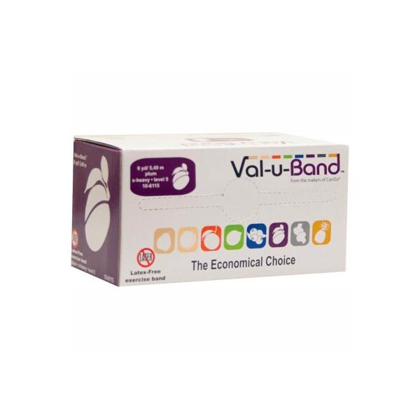 Val-u-band latex free exercise band, plum - level 5, 6 yard roll/box latex free resistive exercise val-u-band is color-coded in berry colors. Latex free val-u-band is an economical latex free exercise band; same great quality as cando latex exercise bands; 5" width band available in dispenser boxes; available in 6, 25 and 50 yard rolls; 50 yard roll has core for use with dispenser systems. Levels range in order of resistance from least to greatest resistance: pear -0), peach -1), orange -2), lime -3), blueberry -4), plum -5), mushroom -6), pineapple -7). 6 yard - plum -level 5).