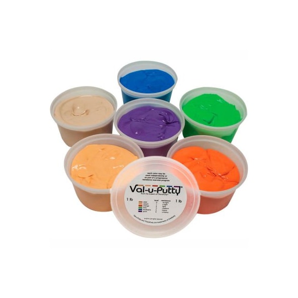 Val-u-putty exercise putty, 1 pound, set of 6 (6 colors) val-u-putty has the same great feel as the traditional cando theraputty hand exercise material. Available in 6 resistance levels. Val-u-putty is available in berry colors. Each color-coded putty has a different consistency ranging from xx-light for strengthening the weakest grasp to x-heavy for developing a stronger grip. The putty material is gluten, casein and latex free. 6 piece set - 1 lb.